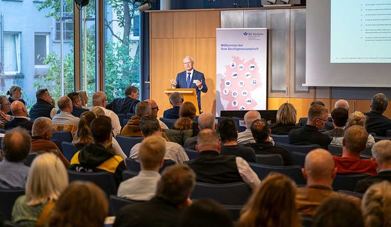 „Wir müssen bei den Unterweisungen wieder näher an die Beschäftigten rankommen, formulierte es Wolfgang Witzke, Vorsitzender der Vertreterversammlung der BG Verkehr und langjähriger Ausbilder für Fahrpersonal beim Entsorger Remondis, am Ende der Branchenkonferenz. Über 100 Teilnehmerinnen und Teilnehmer nahmen vor Ort in der Hauptverwaltung der BG Verkehr teil, 110 weitere hatten sich für eine Online-Teilnahme entschieden.